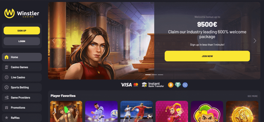 Winstler stands out for its simplicity. The minimalist design keeps focus on what matters – betting and gaming. Its welcome bonus of 100% up to C$600 is straightforward, and payouts via cards, crypto, or eWallets are reliable.