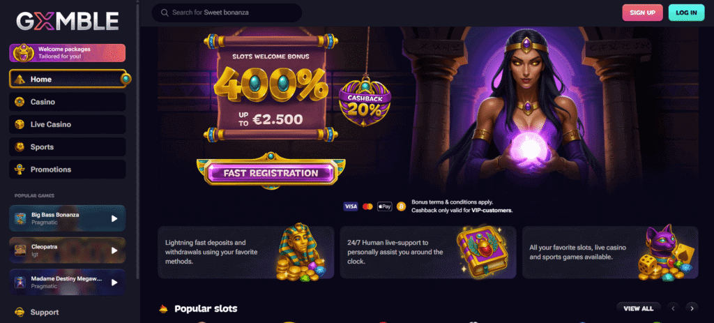 Gxmble has become the go-to spot for Canadian high-rollers thanks to its massive 200% up to C$2,500 welcome offer. Its sportsbook feels premium, with extensive prop markets and enhanced odds on major leagues.